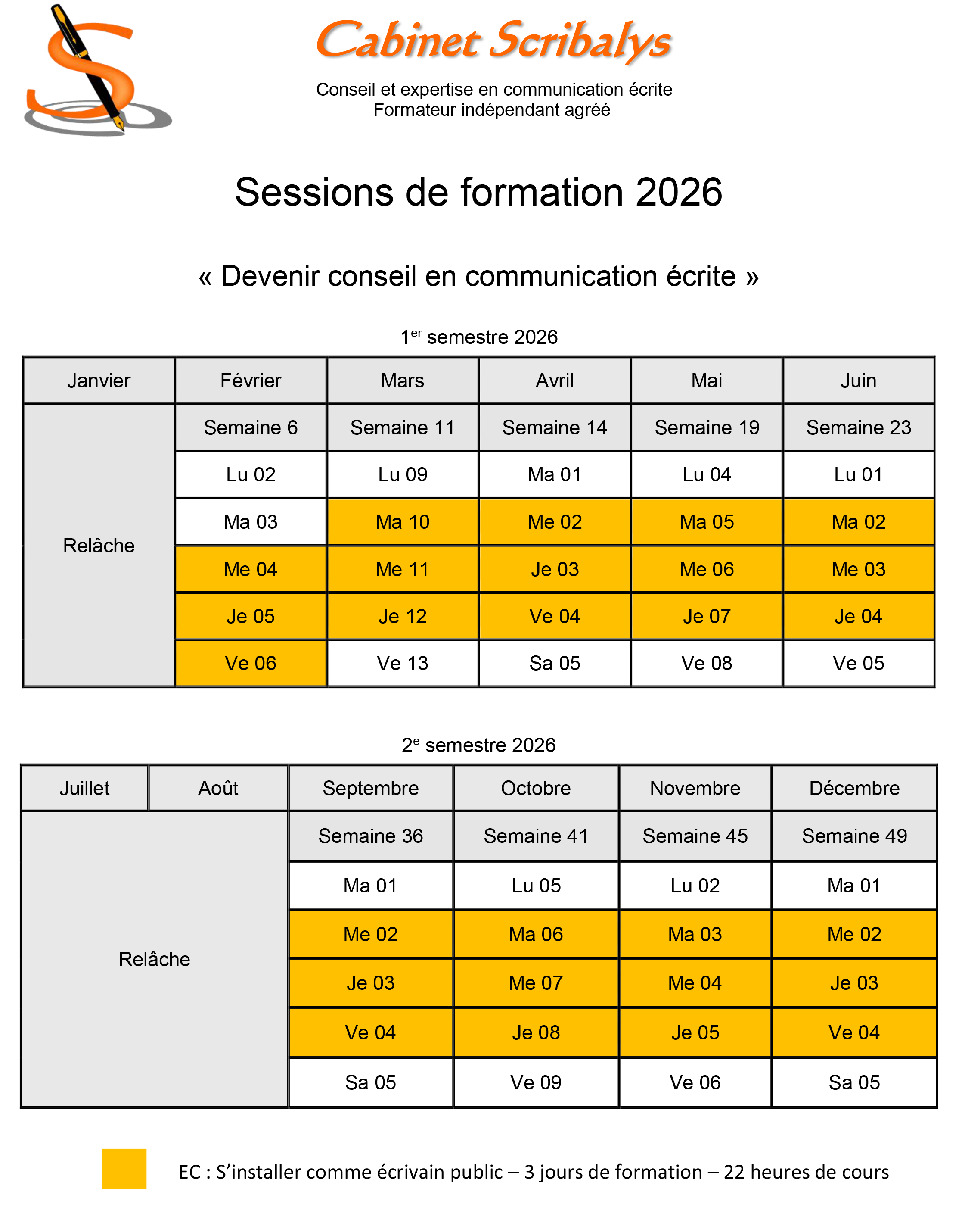 Vous désirez ou allez vous installer prochainement en tant qu'écrivain public, écrivain conseil, prestataire en écriture, conseil en communication écrite, etc. Une session de formation est tout à fait adaptée à votre cas : "Ecrivain public : s'informer pour bien s'installer afin de meiux exercer".